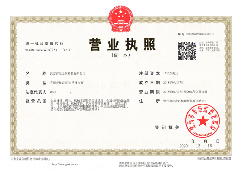 江蘇富冠金屬科技有限公司(以下簡(jiǎn)稱:“公司”)成立于2018年4月,隸屬于鑫昌泰集團(tuán),是常州市經(jīng)開區(qū)招商引資的重點(diǎn)外資企業(yè),注冊(cè)資本1230萬美元,座落于常州市經(jīng)開區(qū)橫山橋智能裝備產(chǎn)業(yè)園,占地面積22762.8平方米,員工總數(shù)100人。公司主要經(jīng)營(yíng):金屬材料、模具、機(jī)械零部件的改性處理;金屬材料的激光處理;模具鋼材、機(jī)械零件、汽車零部件研發(fā)設(shè)計(jì)、加工及銷售。并具有真空淬火、普通淬火、調(diào)質(zhì)、去應(yīng)力回......